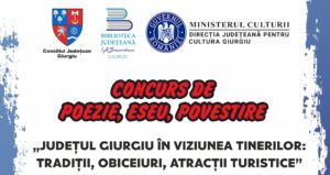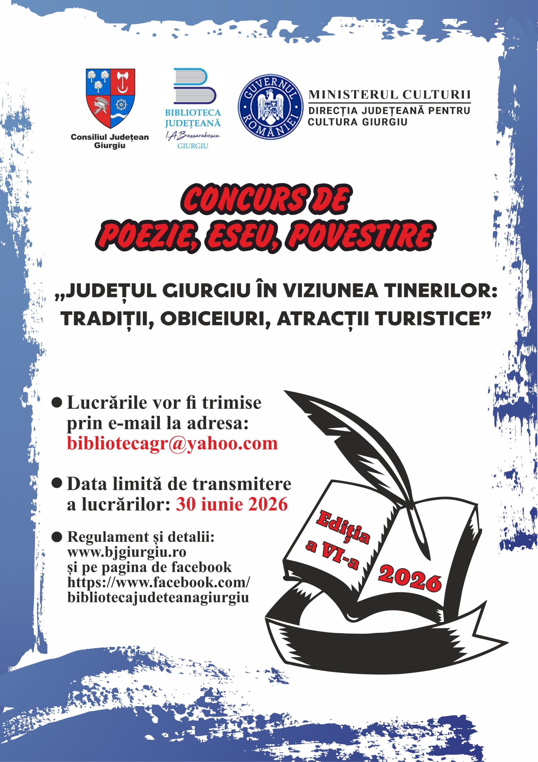 Biblioteca Județeană „I. A. Bassarabescu” Giurgiu, în parteneriat cu Direcția Județeană pentru Cultură Giurgiu, anunță lansarea celei de-a VI-a ediții a Concursului de Poezie, Eseu și Povestire „Județul Giurgiu în viziunea tinerilor: tradiții, obiceiuri, atracții turistice”, un proiect cultural dedicat tinerilor din județ, pe care îi invităm, astfel, să exploreze și să valorifice, prin creație literară, identitatea culturală și patrimoniul local.